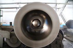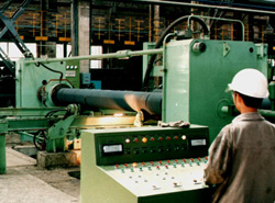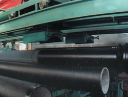 ●工藝簡(jiǎn)要:將承口芯安裝到離心機上,球化合格的鐵水倒入定量包內,按照工藝規定要求,設定孕育劑加入量、管模粉加入量,計算機控制離心機的旋轉速度、行走速度及定量包的翻轉速度,鐵水隨著(zhù)定量包的翻轉及離心機的行走澆注在旋轉的管模內,并凝固成管子,拔管鉗將管子從模內拔出。